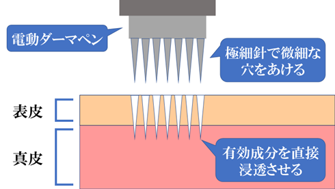 電動ダーマペンは無数の針穴から有効成分をお肌の奥に浸透させていく治療です。そのため表皮の角質と真皮に微細な刺し傷をつけているため、多少、お肌の赤みが出ます。