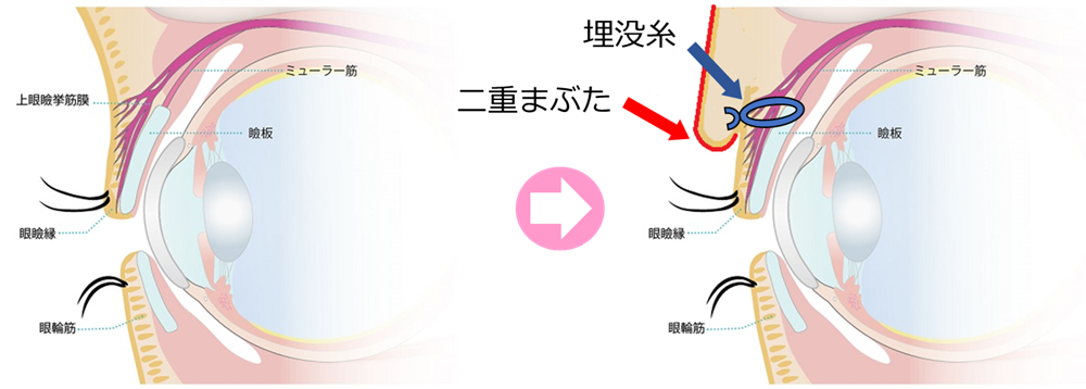 『瞼板法』は結膜側で瞼板に埋没糸を通す方法をいいます。瞼板法はまぶたを閉じた時に、眼球の角膜に埋没糸が当たることがあり、目のゴロゴロ感がしばらく続く場合があります。