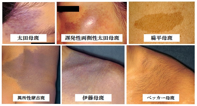 太田母斑は額、目の回り、頬、鼻、耳介に生ずる青あざで顔の片側に生じますが、稀に両側性に生ずることもあります。太田母斑は生後半年以内に生ずることが多く、出生時に存在することは稀です。また、思春期に色が濃くなったり、20歳~40歳台に新たに色素斑が発症することも稀ではありません。典型的な太田母斑は青紫色から灰紫青色で、そこに薄い褐色の小色素斑が混在します。シミと思っていても青色ないし灰紫青色の点状の色素斑が混じっている場合は太田母斑の可能性があります。また、目の下の『くま』も軽症の太田母斑である可能性があります。しばしば白眼のところに青色の色素斑が存在することがありますが、この場合は出生時に顔に色素斑が存在しなくても、ほとんどの症例が思春期までに顔に青アザが生じ、しかも色素斑は広範囲に拡大することが多いようです。肩から肩甲骨にかけて生ずる青アザは伊藤母斑と呼ばれ、これも自然に消失することはありません。