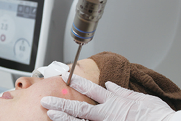 シミは肌の老化あるいは紫外線や外傷などの影響によって、皮膚の奥にあるメラノサイトが刺激されて過剰にメラニン色素が残ってしまった状態のことを言います。 Qスイッチヤグレーザーは、2種類の波長(532nm、1064nm)を有し、シミやアザの原因であるメラニン色素に対して吸収が高く、メラニンを有する細胞のみ選択的に治療することができる医療レーザー機器です。 Qスイッチ(Quality Switchingの略)と呼ばれるシステムによりレーザーパルスの照射時間が非常に短く、周辺の正常組織への影響を最小限に抑えて安全に表皮、真皮層内にある過剰なメラニン色素を選択的な熱ダメージを与え、破壊してくれます。 また、肝斑(かんぱん)や色素沈着にもレーザートーニングという有効な治療が行えます。