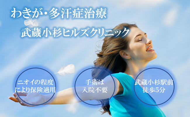 わきがは、男女共に通常思春期(腋毛の発毛時期)より発症し、両親のどちらか又は親族にわきが体質の方がいることが多く、体質のため途中から突然わきがになったり、他人から感染することはありません。 汗をかいて「わきの臭いや汗じみになっているのではないか?」と気になってしまう瞬間はありませんか?臭いや汗じみに対して敏感な現代社会において、わきが・多汗症はとても深刻な悩みです。武蔵小杉ヒルズクリニックは、数多くのわきが・多汗症治療を行ってきた医師が担当します。「保険適用可能な手術(剪除法)」から「切らない最新わきが・多汗症治療(ミラドライ)」まで、様々な治療方法をご用意しています。わきが・多汗症でお悩みの方は、お気軽にご相談ください。