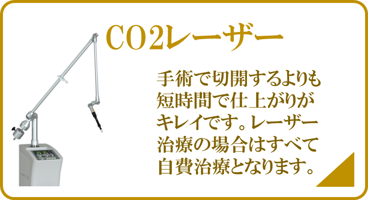 炭酸ガスレーザーを使用してほくろ・いぼ・皮膚のできものなどを蒸散させて治療することができます。炭酸ガスレーザーはメスで切開した場合よりも短時間に治療ができ、キズ跡が残りにくく出血もほぼないため仕上がりがキレイで、安心して治療を受けていただけます。病変部や治療部位によっては数回に分けたレーザー治療、もしくはメスによる切除が望ましい場合があります。